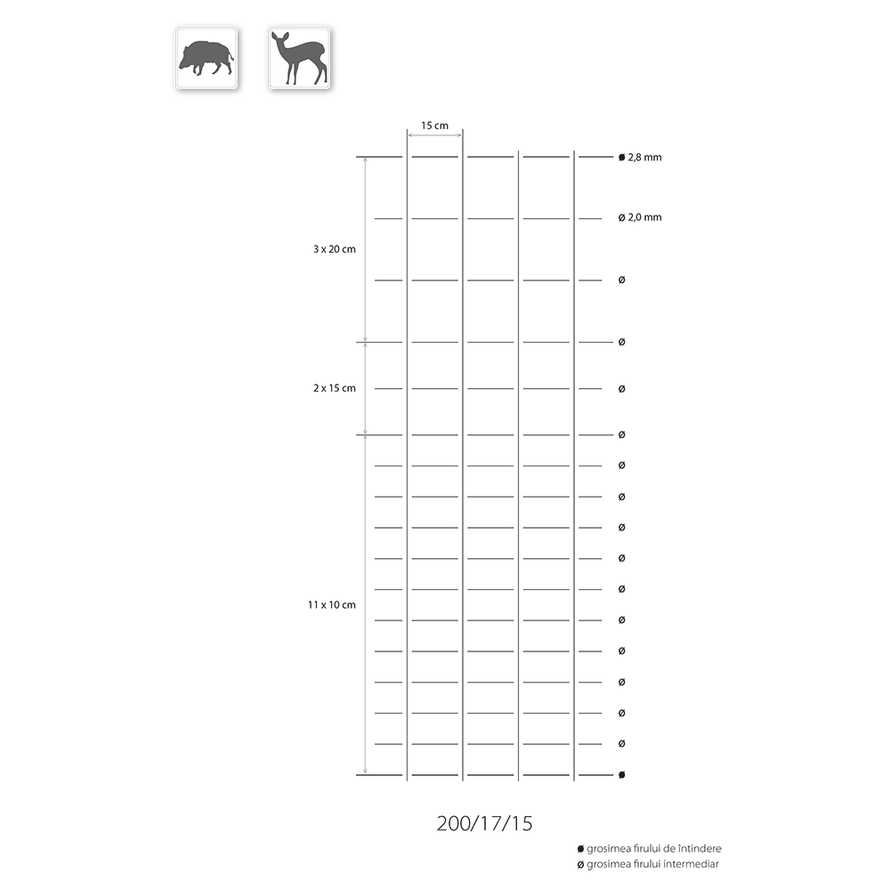 - Dimensiune: 2.8x2x15x200x50 ml (grosime fir margini x grosime fir x dimensiunea ochiului x înălțime x lungime).